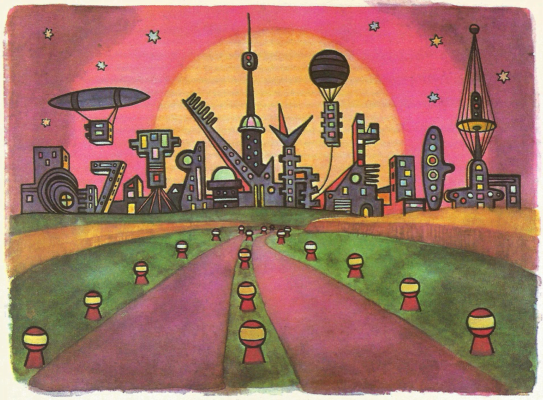 V roce 2061 kdosi bude sedět v pokoji, vybraně, ale prostě zařízeném, zářícím kouzelnými barvami poloprůhledných polymerních látek, v jednom z domů zahradního města. Právě se vrátil tryskovým vozem nebo vrtulníkem – samozřejmě obecním – z pracoviště, kde dvě hodiny v pětidenním týdnu má možnost uplatňovat své síly – potřebu každého zdravého člověka. Na stole stojí pokrmy (nepoznali byste je), které si vybral (slovo „koupil“ se dávno stalo archaismem). Mnohé, co se nám zdá prázdným výmyslem, je pro něho natolik samozřejmé, že to ani nepozoruje.